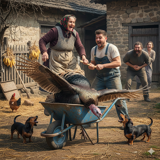 U trenutku kada je Vladan ćurana „potkačio“ sekirčetom — više simbolično nego smrtonosno — ćuran je, očigledno uvređen celom scenografijom, podigao svoja golema krila i krenuo da trči po dvorištu. I to ne sam, nego sa sve babom koja je poskakivala i vrištala na kolicima, držeći se za ivice kao da jaše najluđu rodeo atrakciju koju je selo ikada videlo.