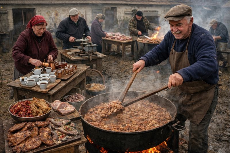Mama je tog dana kuvala kafu i sipala rakiju za „majstore“, baba je pripremala kotlanku za čvarke, deda oštrio noževe…Prava jesenja idila. Pa miris sveže krmenadle i svinjske džigerice s belim lukom, ee to je bila hrana. Bez ikakvih priloga od barenog povrća, samo meso i eventualno turšija i kiseli kupus sa belim lukom i tucanom paprikom. A tata, iako kaže da je teniski lakat zaradio od višedecenijskog tamburanja, mislim da mu je mešanje čvaraka u tome dosta pripomoglo. Neko secka šnicle, neko melje meso za kobasice, neko meša čvarke, neko usoljava polutke, neko barata brenerom, svako ima svoje zaduženje – prava porodična manofaktura.